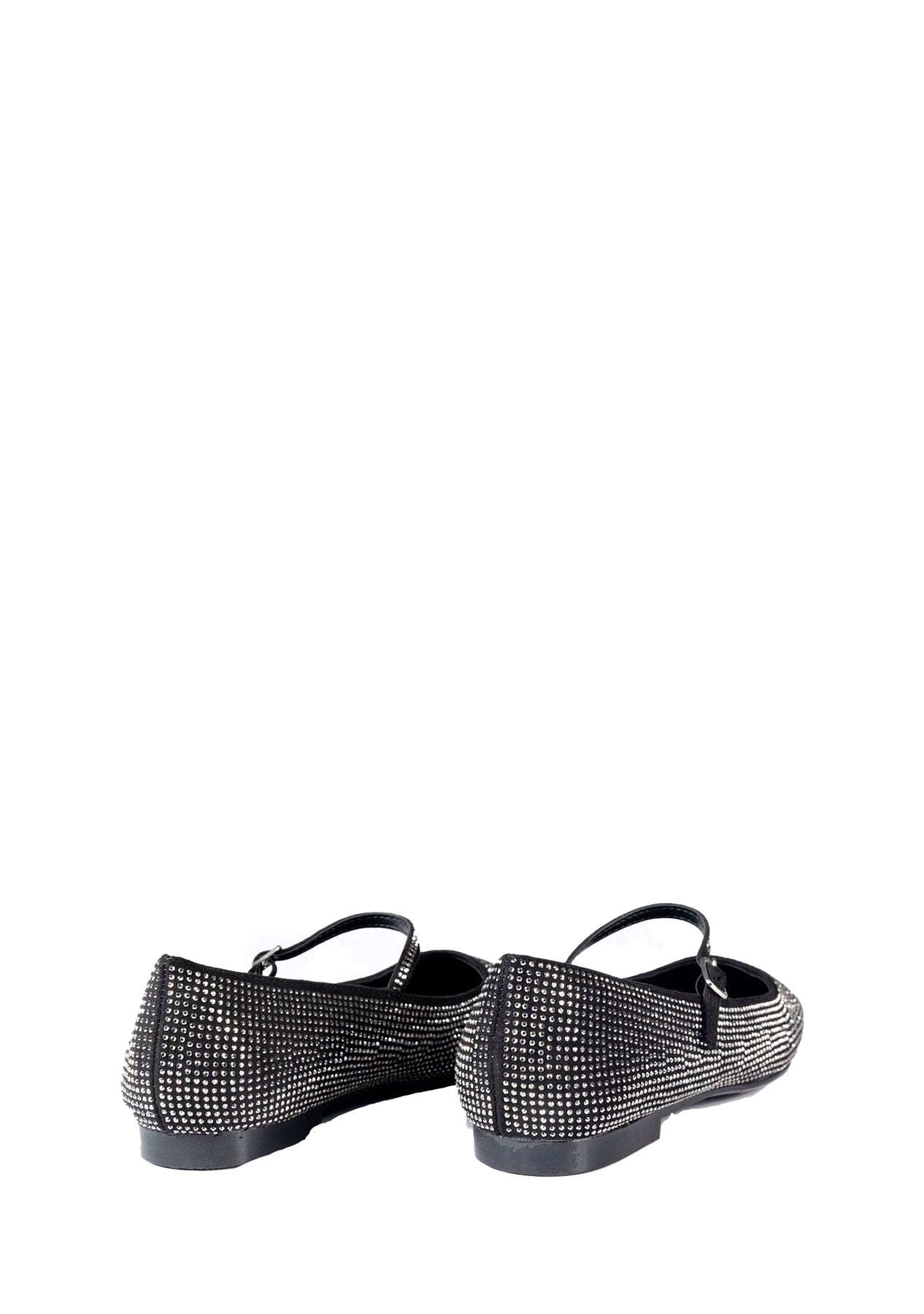 Ballerina a punta quadra in tessuto scamosciato ricoperto di strass con fibbia e cinturino.