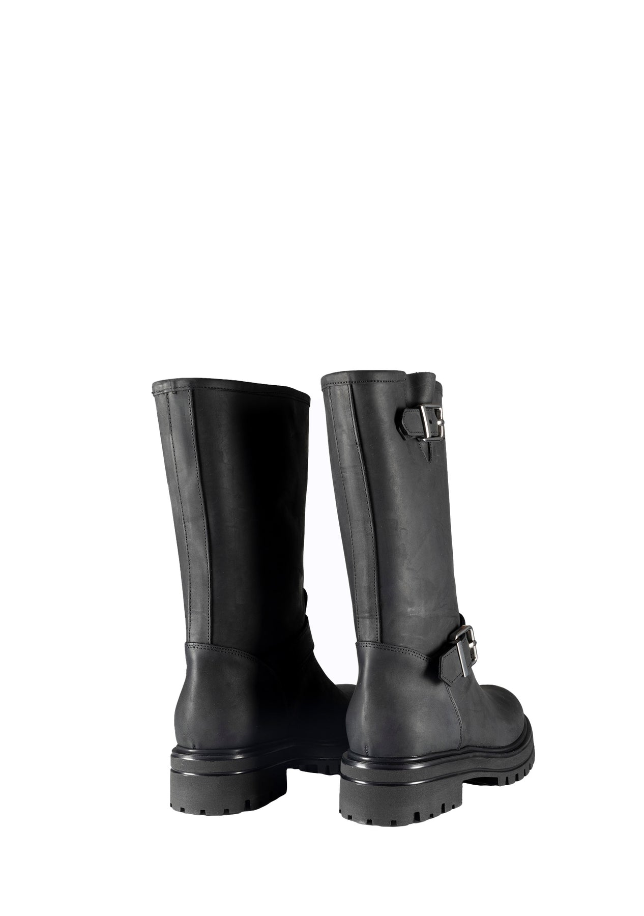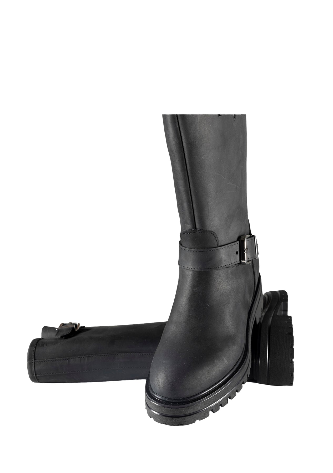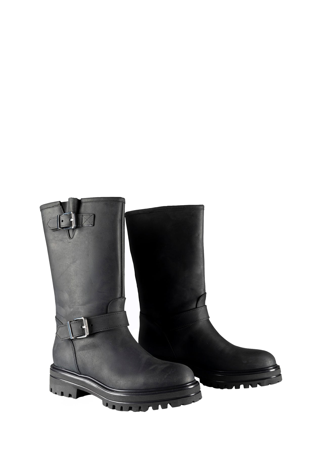 Stivale modello biker in pelle con gambale largo.