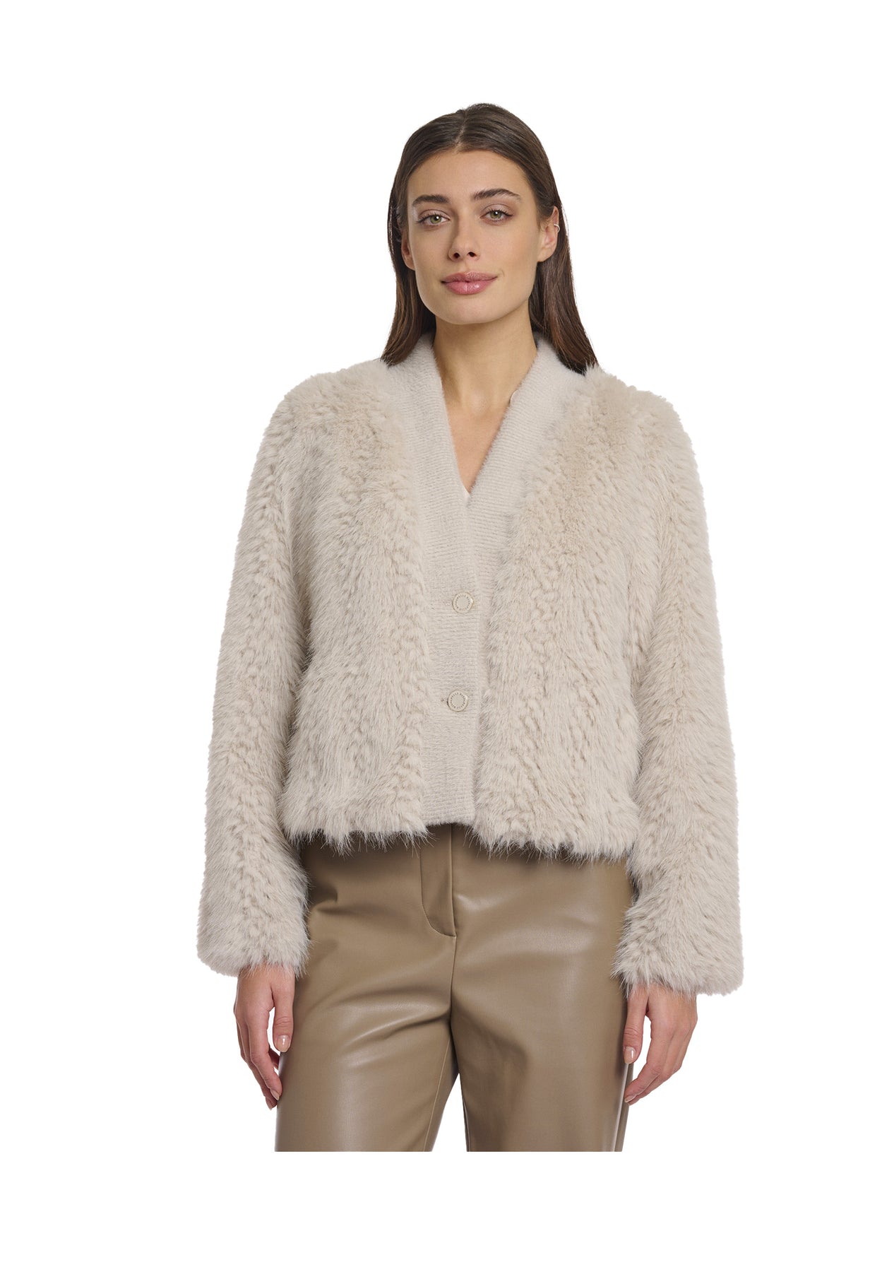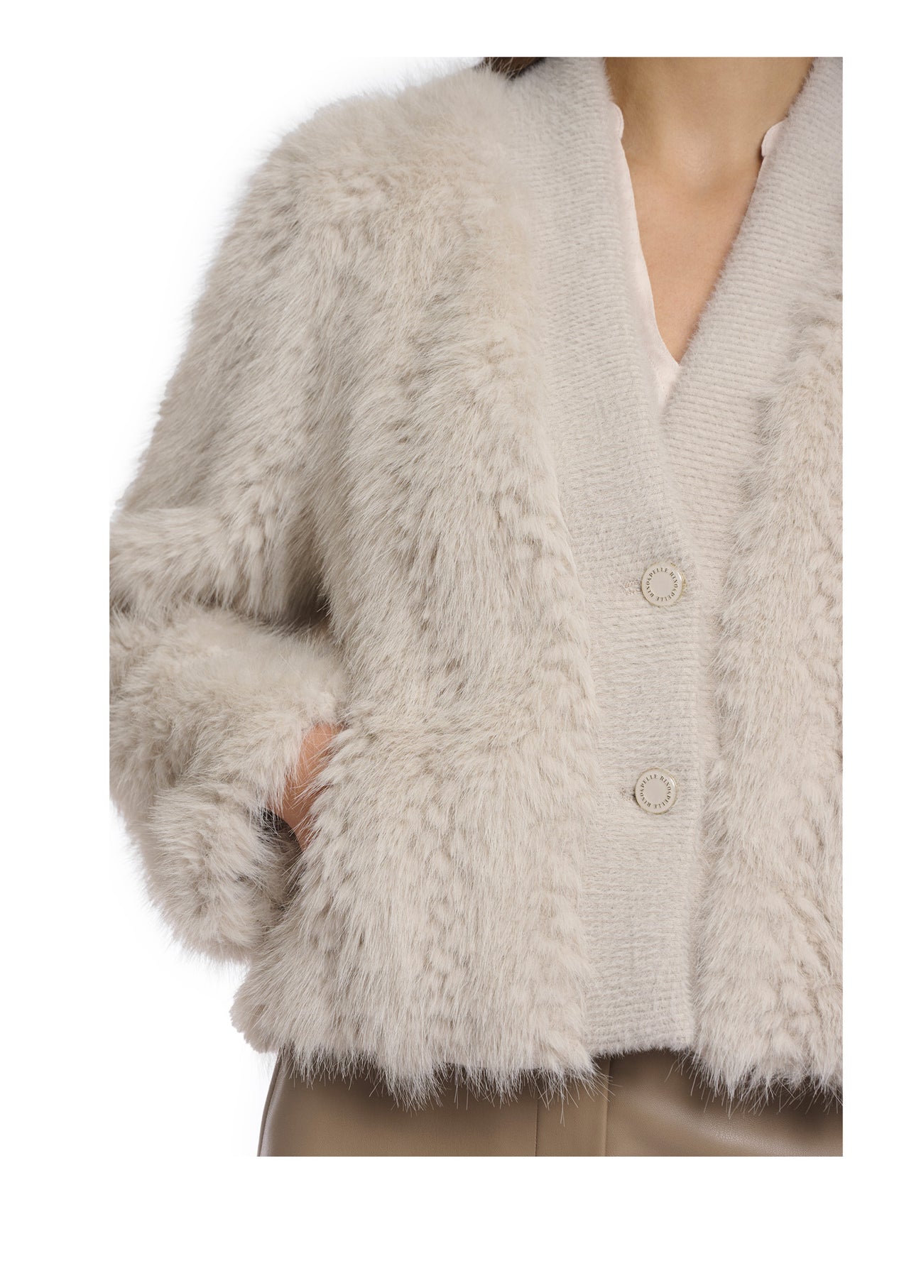 Questo elegante cardigan presenta un corpo in pelliccia sintetica lussuosa e soffice,