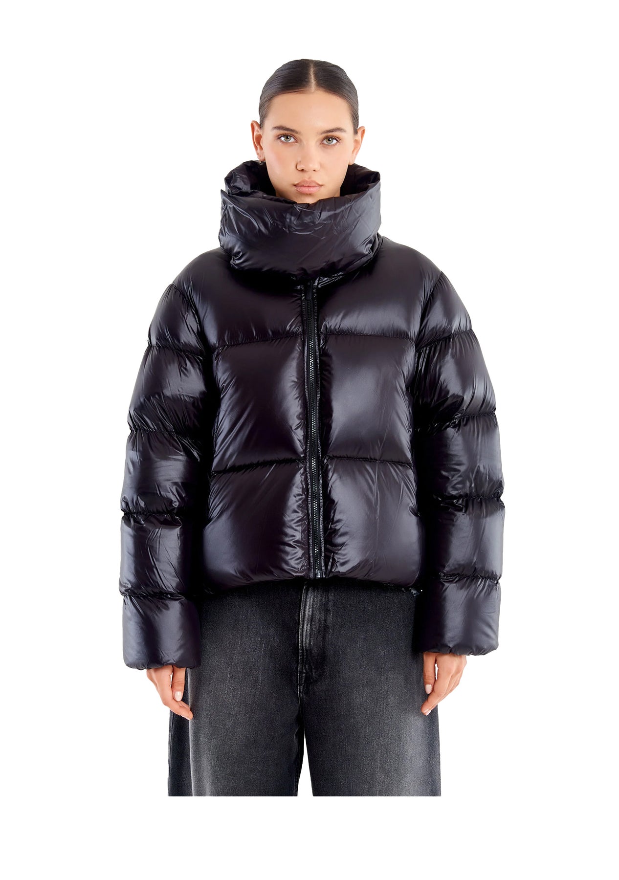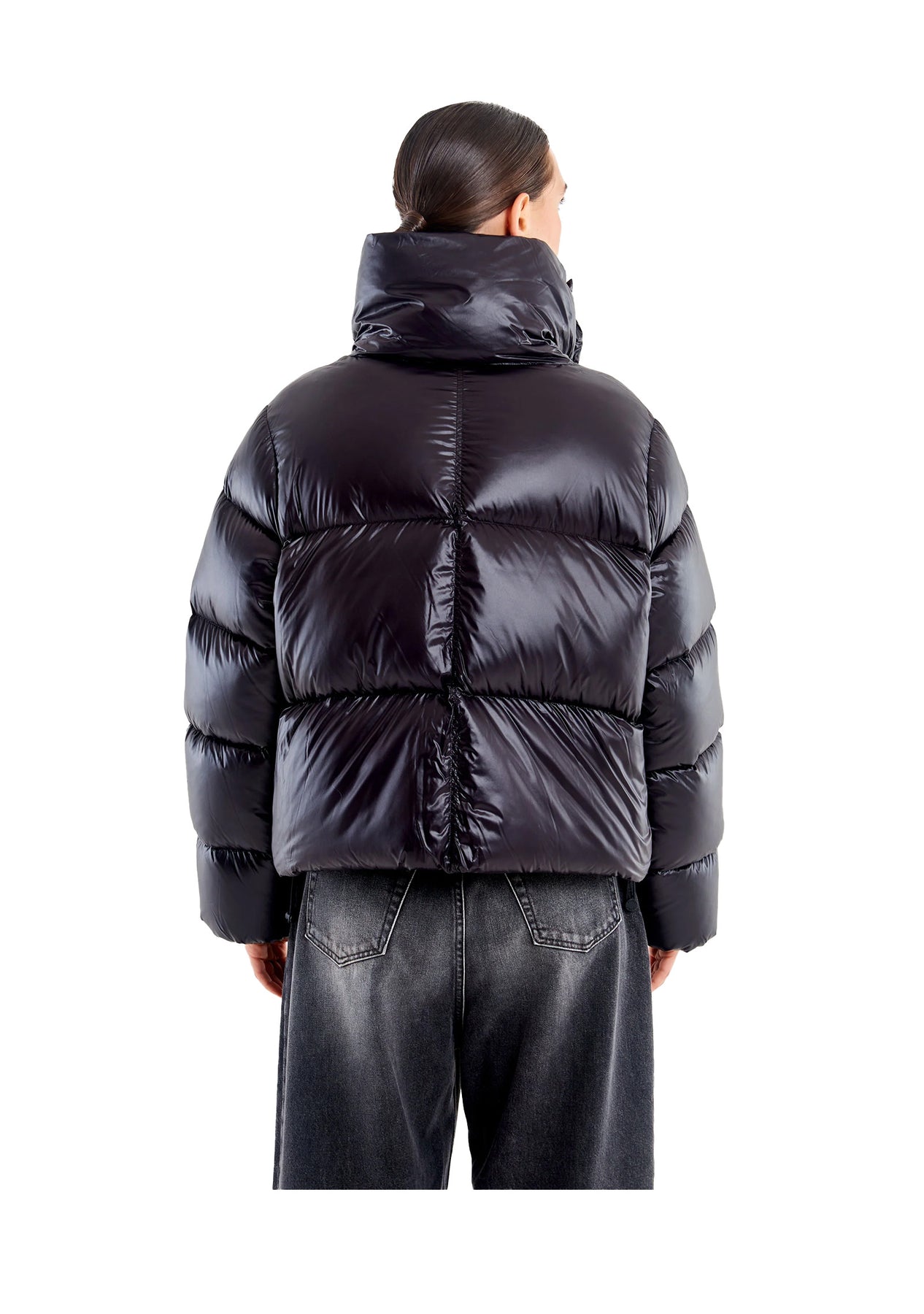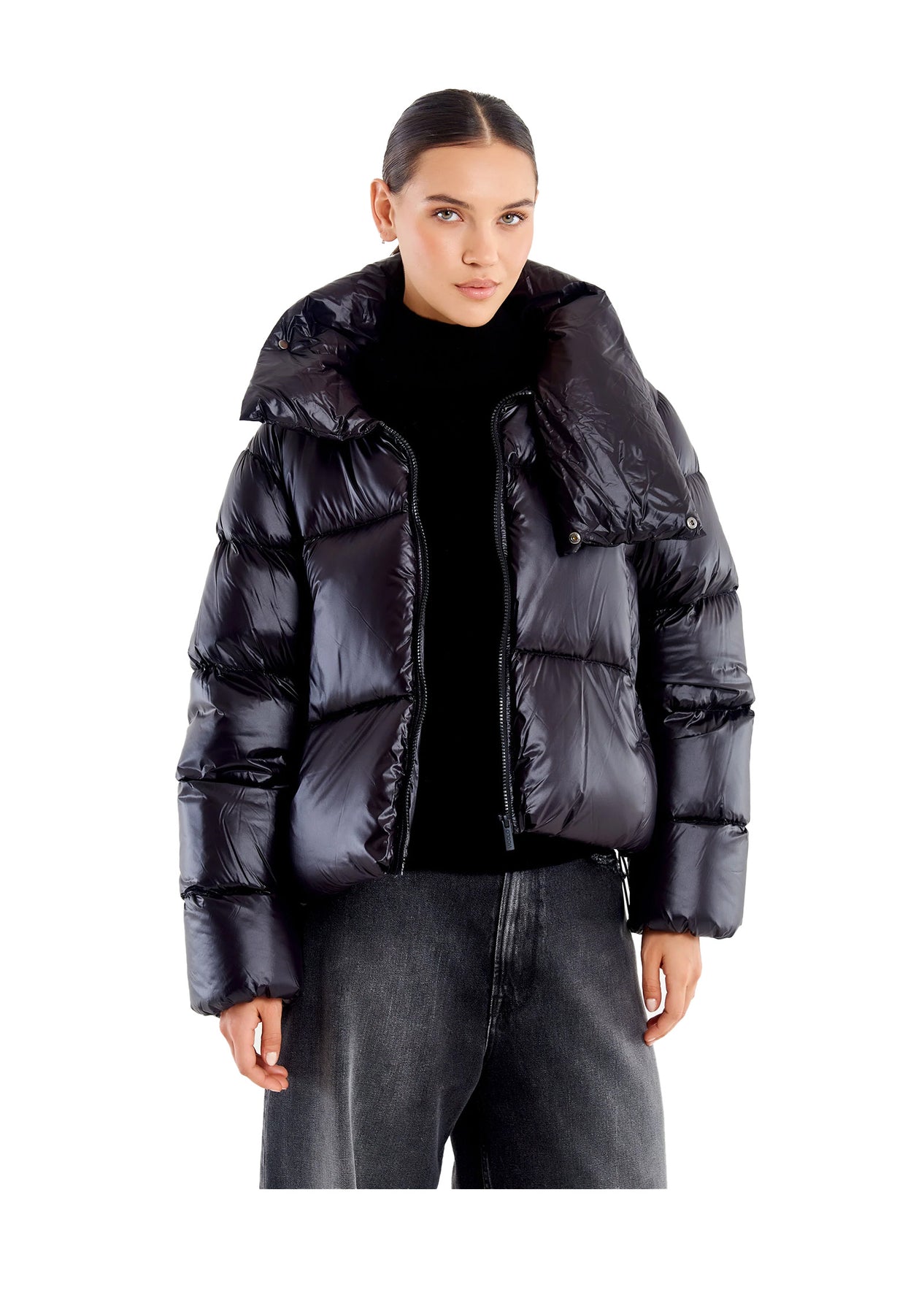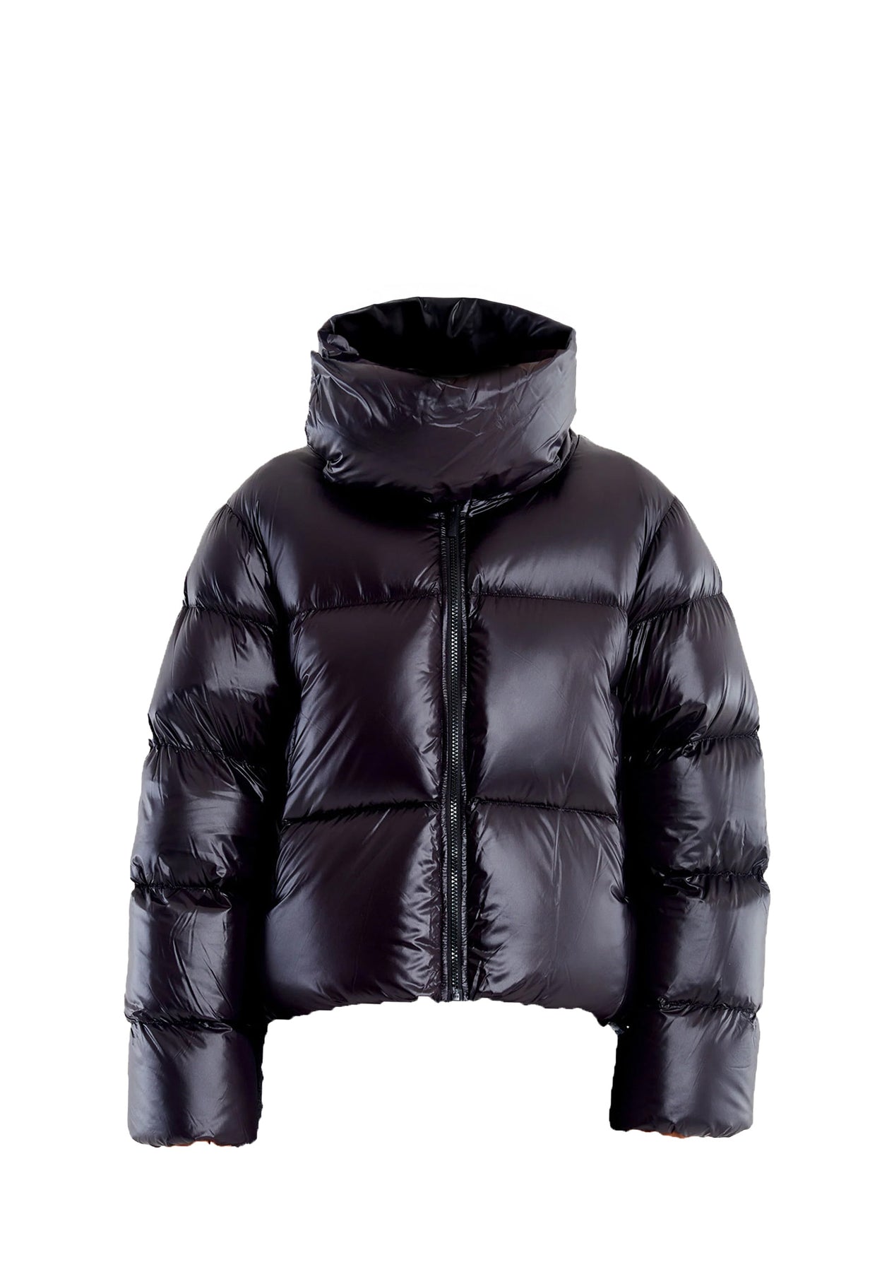 Piumino corto maniche lunghe con collo alto asimmetrico.