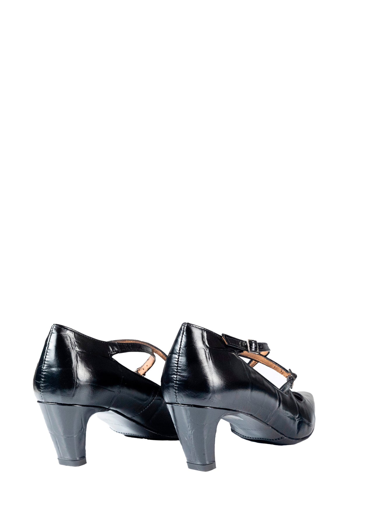 Decolletè in pelle nera leggermente lucida, con finitura effetto coccodrillo.
