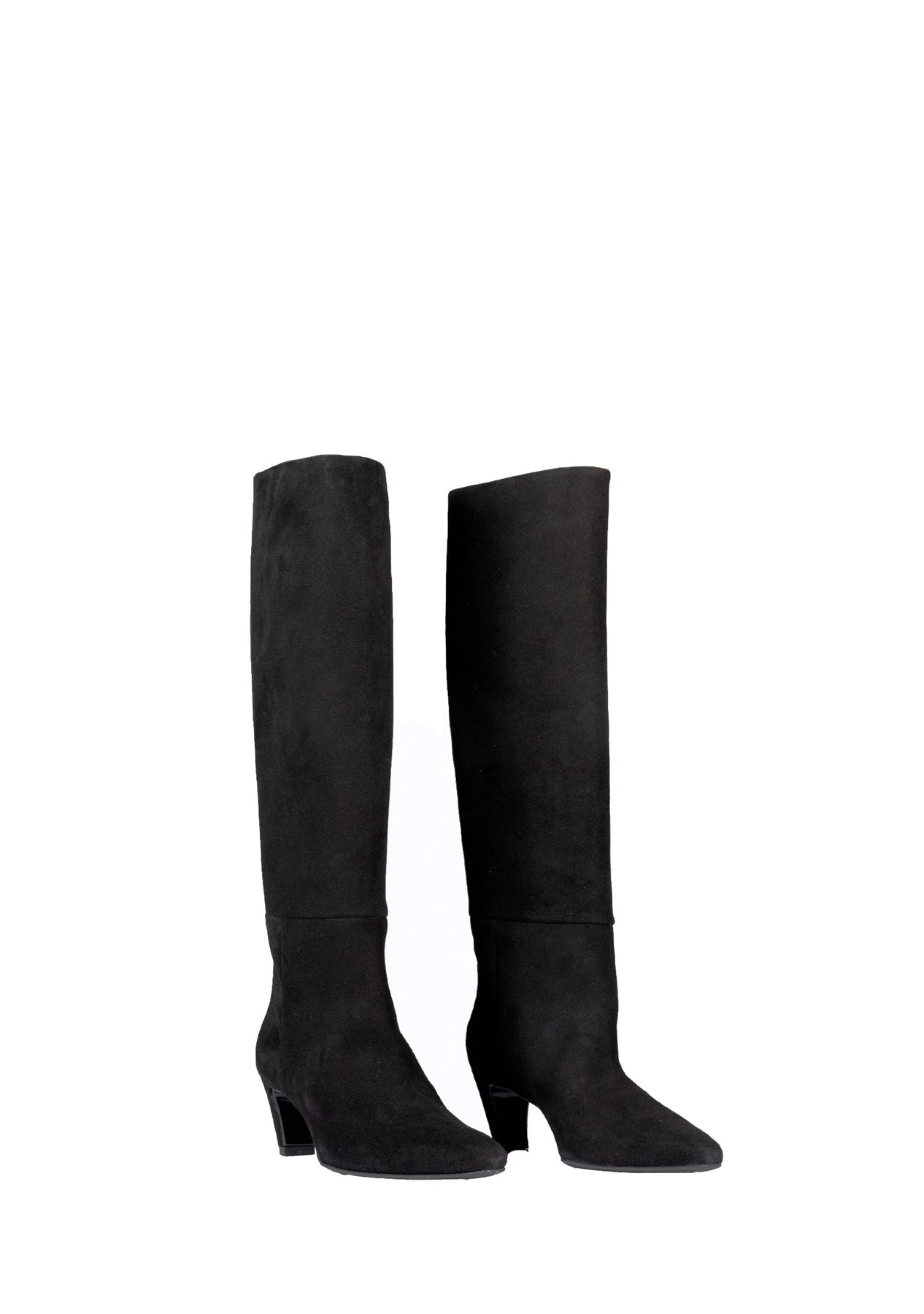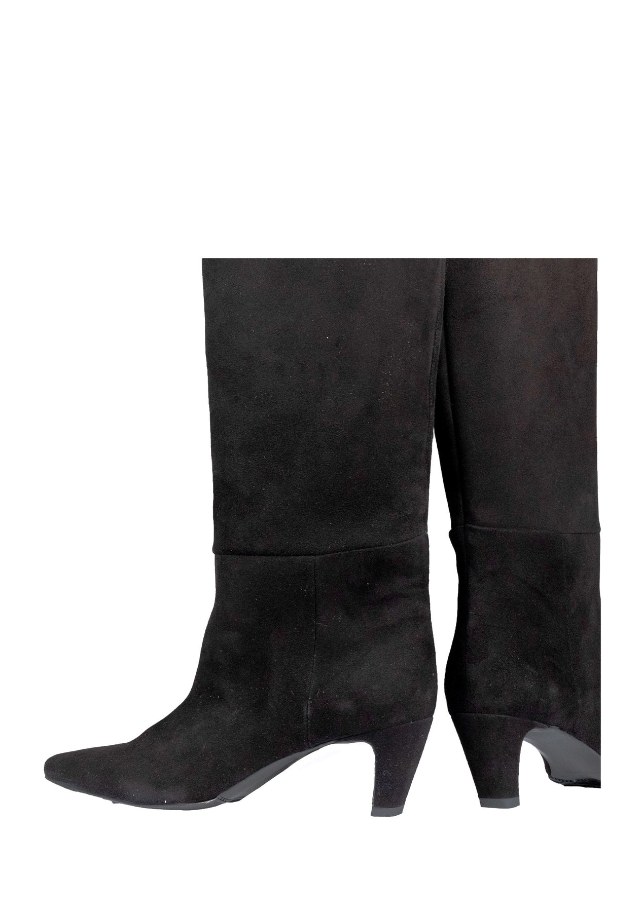 Stivale al ginocchio con forma a tubo, punta affusolata e tacco comodo a imbuto.