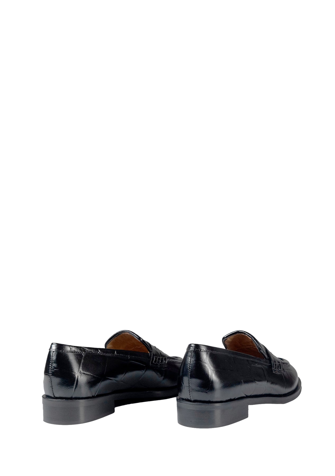 Mocassino in pelle nera leggermente lucida, con finitura effetto coccodrillo.